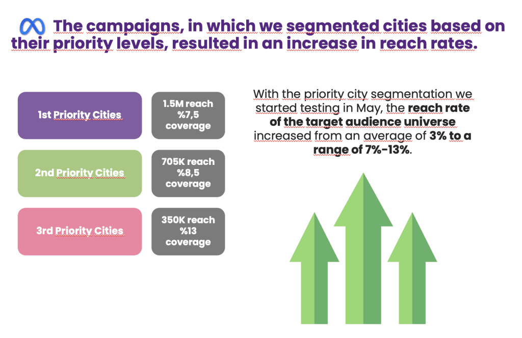 By the end of the test, location-based segmentation significantly improved audience reach rates. Overall, the reachable audience ratio in priority cities increased from 3% to a range of 7%-13%. This demonstrates the effectiveness of segmentation and the positive impact of focusing on targeted cities.